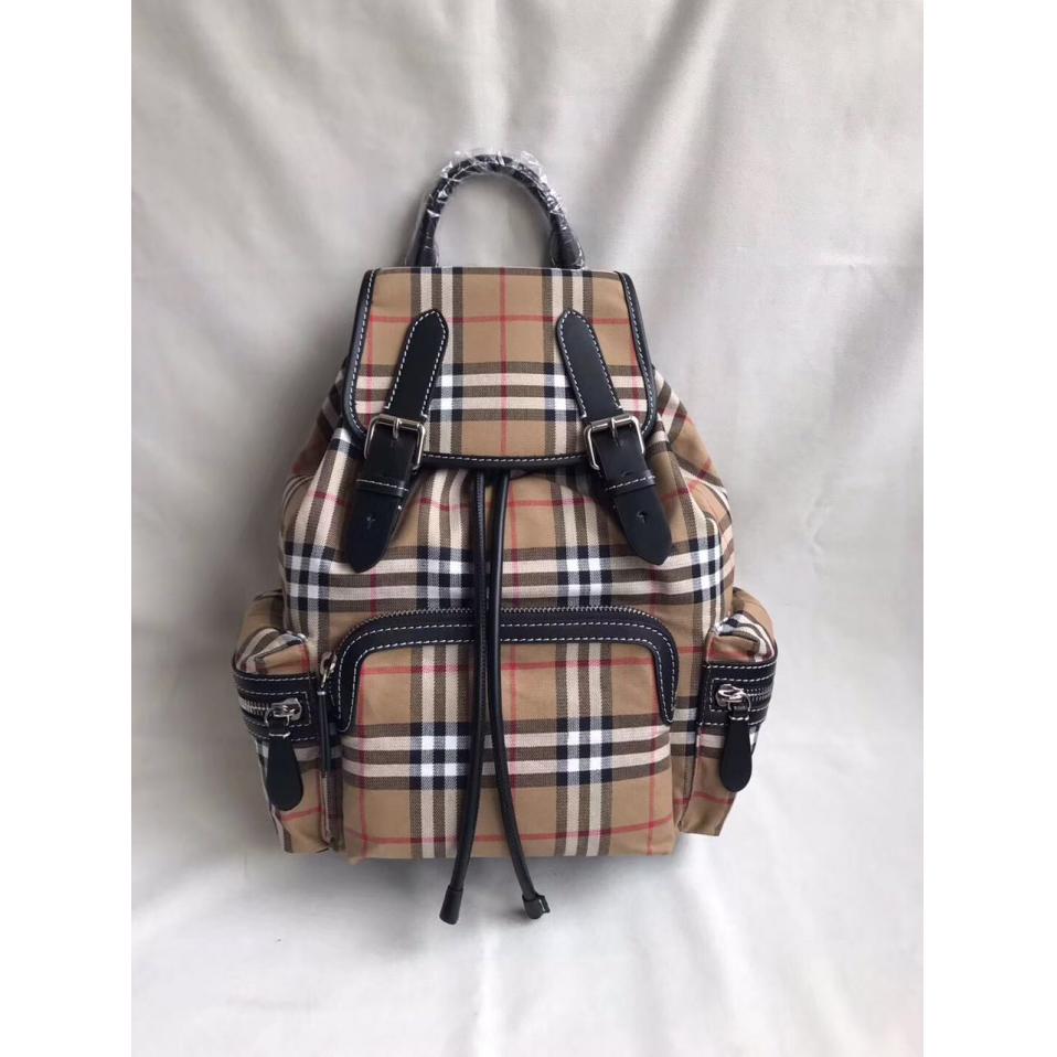 巴宝莉军旅背包细节图 B家军旅背包中号,以品牌典藏的军风包款为原型,精选 Vintage 格纹棉质面料匠心打造,装饰缉明线皮革边饰。3个拉链外袋;1个内插袋;1个拉链内袋、皮革顶部提柄;可调式帆布拼链饰肩背带、扣环、按扣与抽绳开合、手绘涂漆边缘、亮泽金属配件 尺寸22×14×33cm