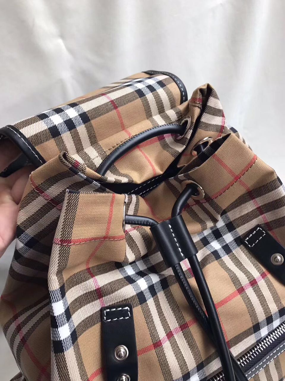 巴宝莉军旅背包细节图 B家军旅背包中号,以品牌典藏的军风包款为原型,精选 Vintage 格纹棉质面料匠心打造,装饰缉明线皮革边饰。3个拉链外袋;1个内插袋;1个拉链内袋、皮革顶部提柄;可调式帆布拼链饰肩背带、扣环、按扣与抽绳开合、手绘涂漆边缘、亮泽金属配件