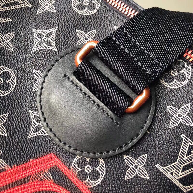 lv男士斜挎包 购物加微信bag88866 新品~SPEEDY BANDOULIERE 40 手袋M43697此款Speedy 40手袋饰有出自男装艺术总监Kim Jones之手的LV颠倒logo 为2018秋季季前展示系列男装设计中的特色元素 暗色Monogram Ink涂层帆布与粉色金属饰件创造出精致的对比感 配有织物肩带与顶部手柄 可肩背 可手提 尺寸:40x25x19cm