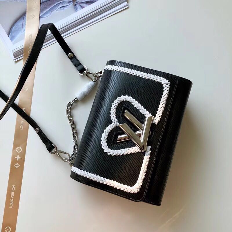 广州奢侈品a货批发购物加微信bag88866 原单~此款做工细致的Twist手袋在包盖处采用精美的编织勾边装饰。2018夏季新品,由经典Epi皮革裁制而成,配有可脱卸包带,采用多段长短调节设计。另配短链手柄,晚宴造型的理想搭配 50282粉色心型编织