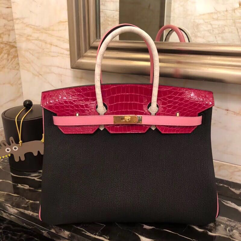 爱马仕柏金包粉色购物加微信bag88866 【现货】2018寻找一份恰到好处的高贵,寻觅一份幸福快乐的时光,难免对比,尽显特色,半手工制作符合原版工艺,蜡线缝制,稀有亮面鳄鱼皮盖头,手柄,专柜倒V压印,国际品牌Artburo特制,享受您的品味人生!Herme* brikin 拼色35cm 鳄鱼纹拼Togo皮 金扣 size:35cm