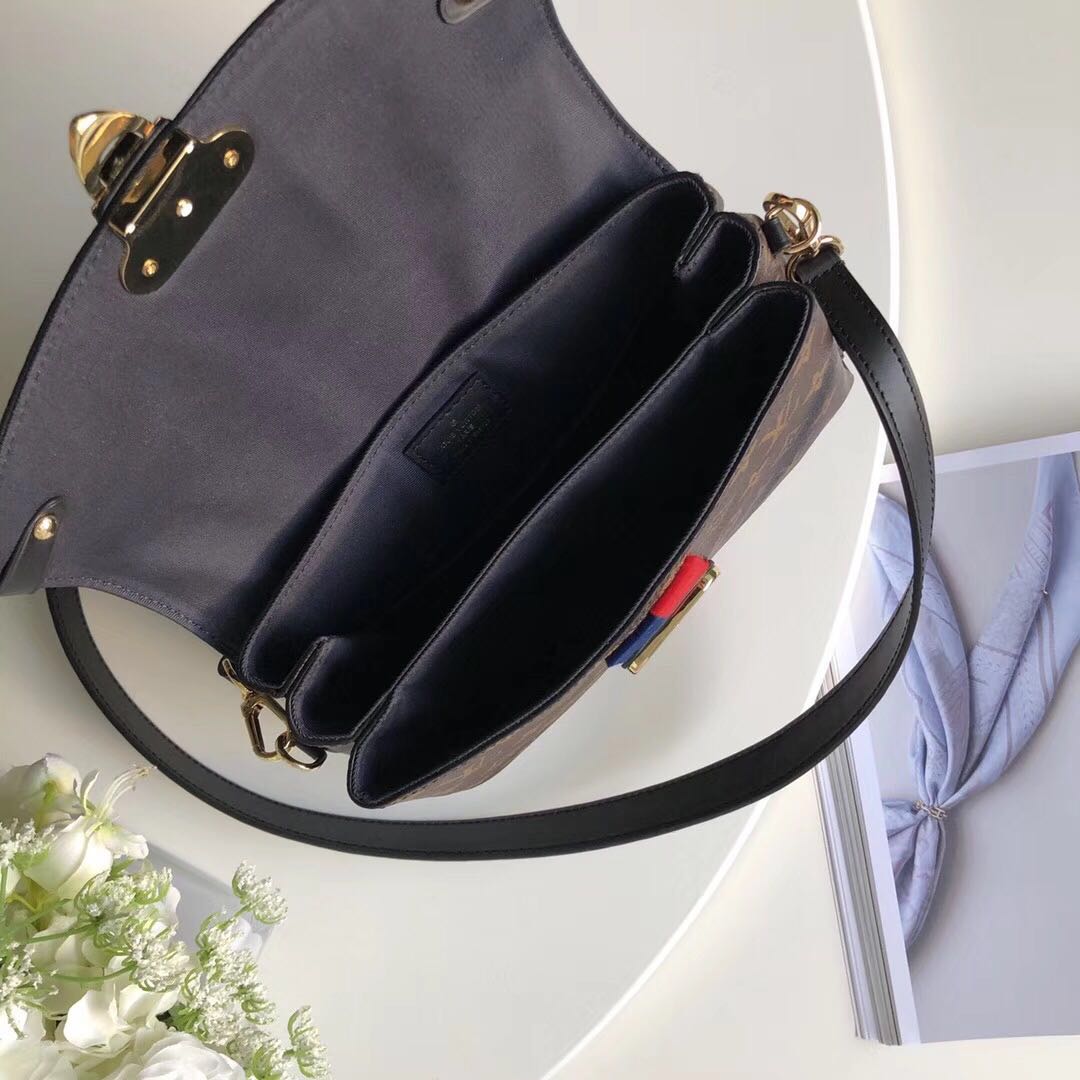M43867 此款由Monogram帆布裁制而成的单手柄Georges BB手袋融入众多源自路易威登经典硬箱的细节设计,如簇绒双色条纹与标志性的金色锁扣。容量充盈、井井有条的内部结构,配有一对独立式隔层,职场女性的理想之选。详细特征