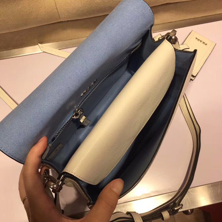 去日本必买的东西购物加微信bag88866 到货了2018年最新款 lBD082,Prada Etiquette手袋采用进口小牛皮 锡铅色金属配件 金属钉饰边 ,对比色皮革标识 ,双内袋可肩背,超级实用 无敌美美哒!女神必备 尺寸23乂高15x底10cm