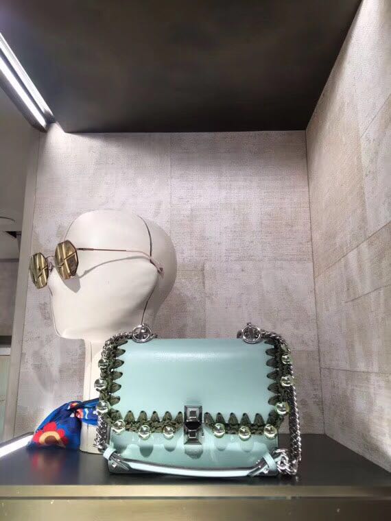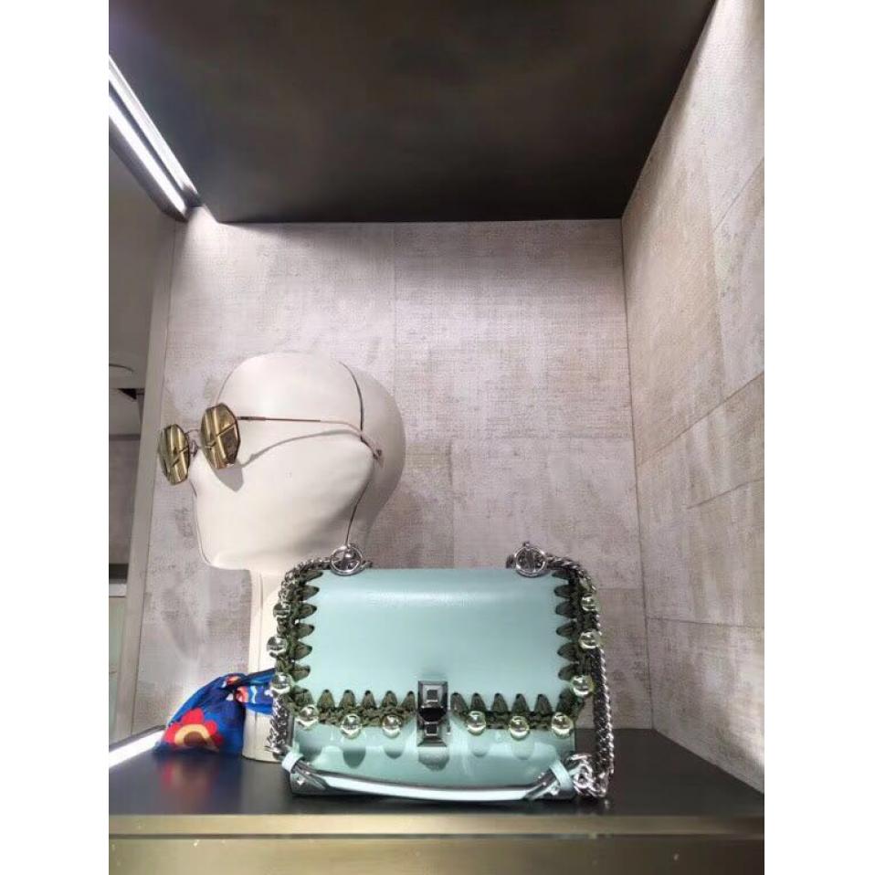 韩国机场有芬迪专柜吗购物加微信bag88866 Fendi 633 翻盖式手袋,开合处有两个双色塑料玻璃铆钉,可滑动链条长肩带,可斜背亦可手提,小牛皮制成,盖头编织线穿孔金属电镀珍珠装饰而成。19cm全套包装发票(手提及挂件另外付费)
