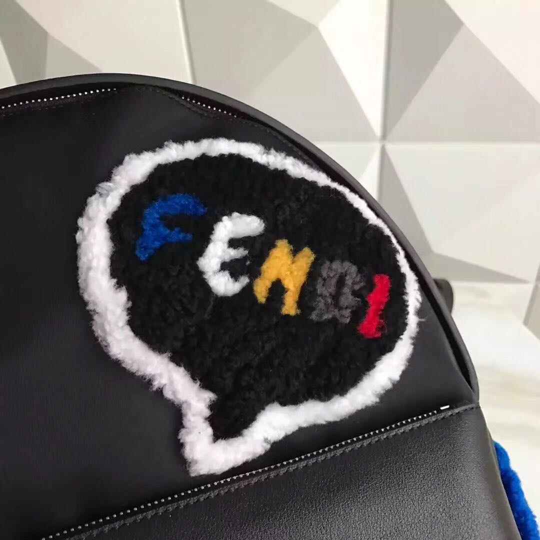 芬迪小怪兽双肩包材质 FENDI 2319 尼龙布配牛皮背包,饰以羊毛笑脸,织物背带,背面透气科技网眼面料,34cm
