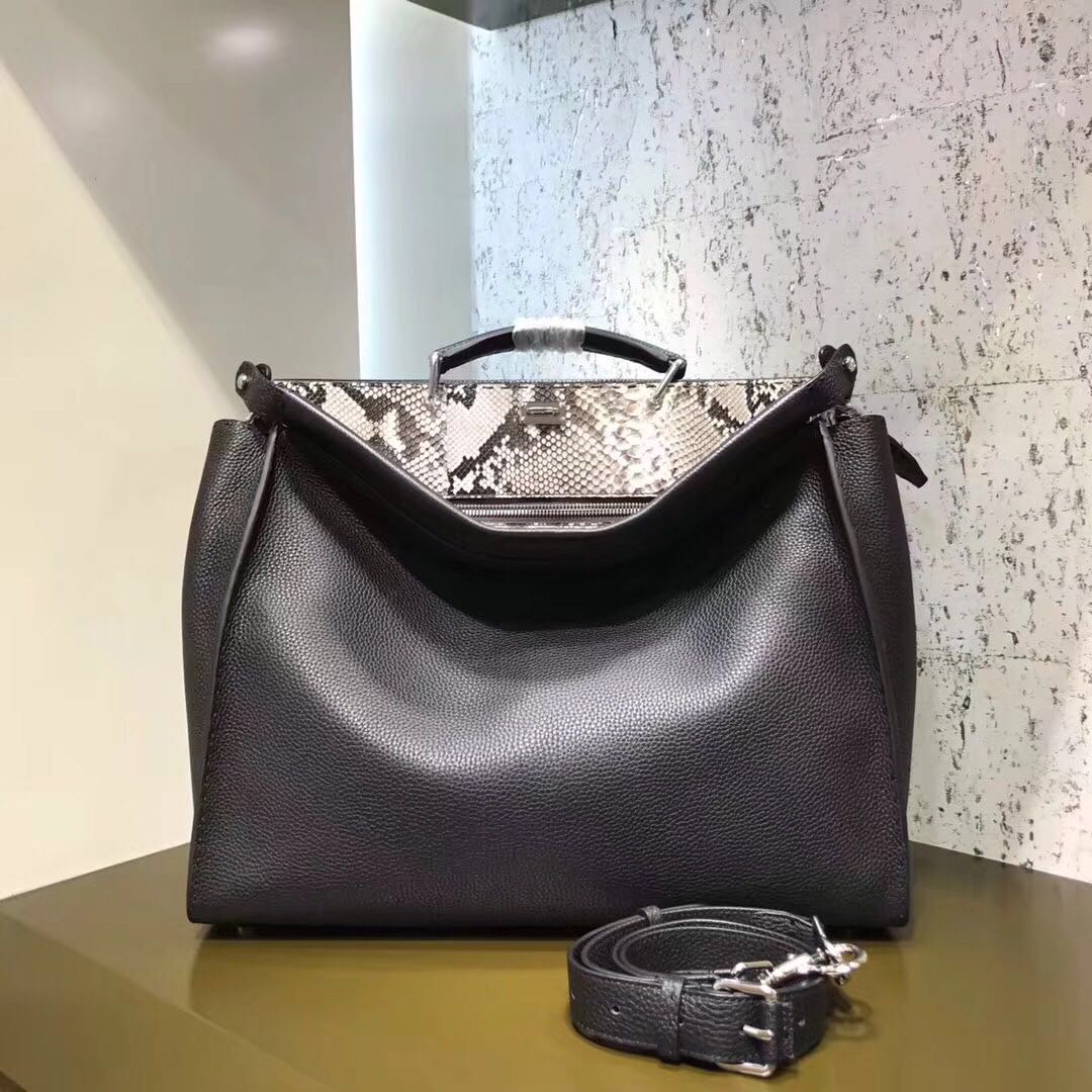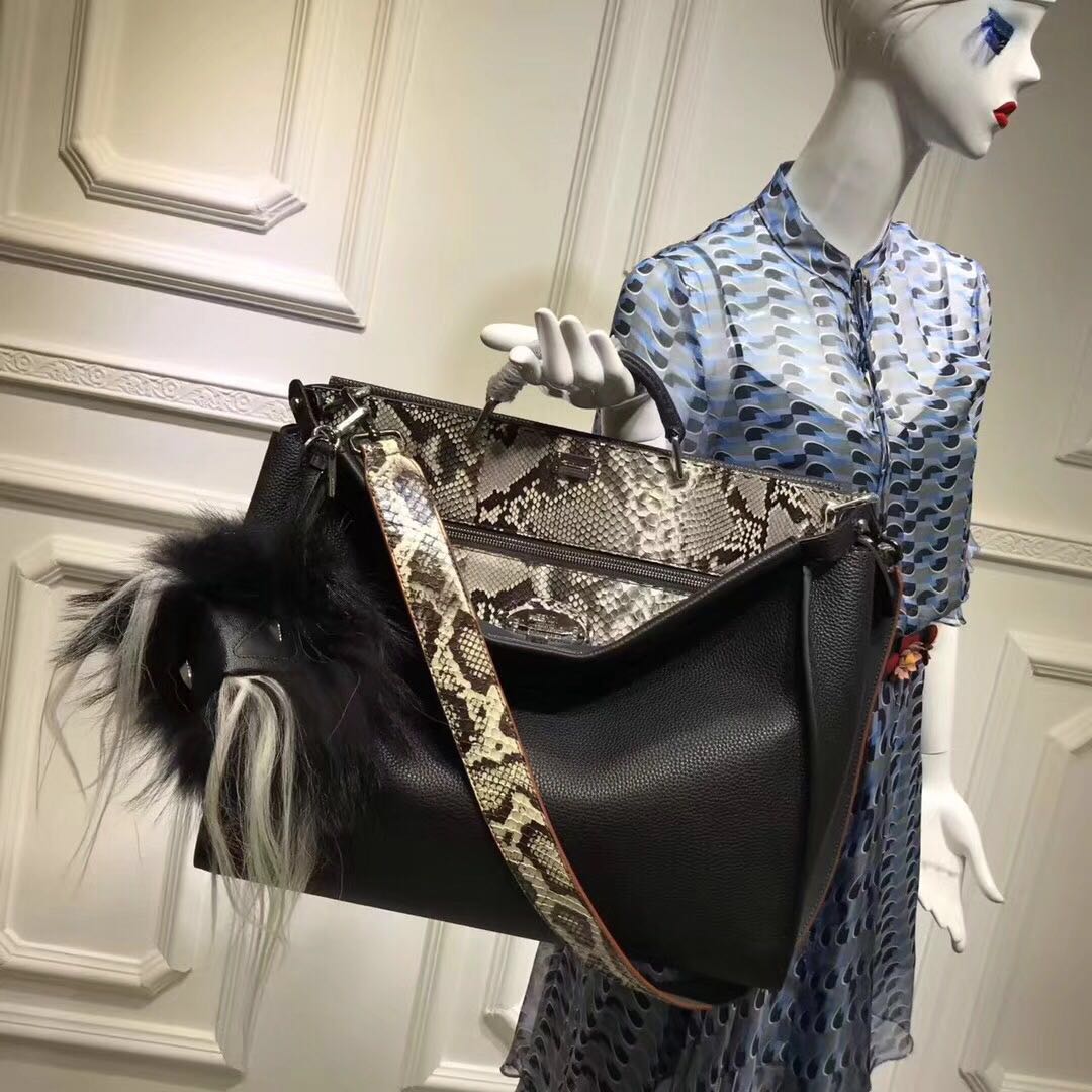 芬迪小怪兽蟒蛇皮 FENDI 6516 黑色罗马手提包,饰以手工缝线,岩石色蟒蛇皮硬隔板。通过挂钩分隔出两个隔层。公文包提手和可调节可拆卸肩带42cm
