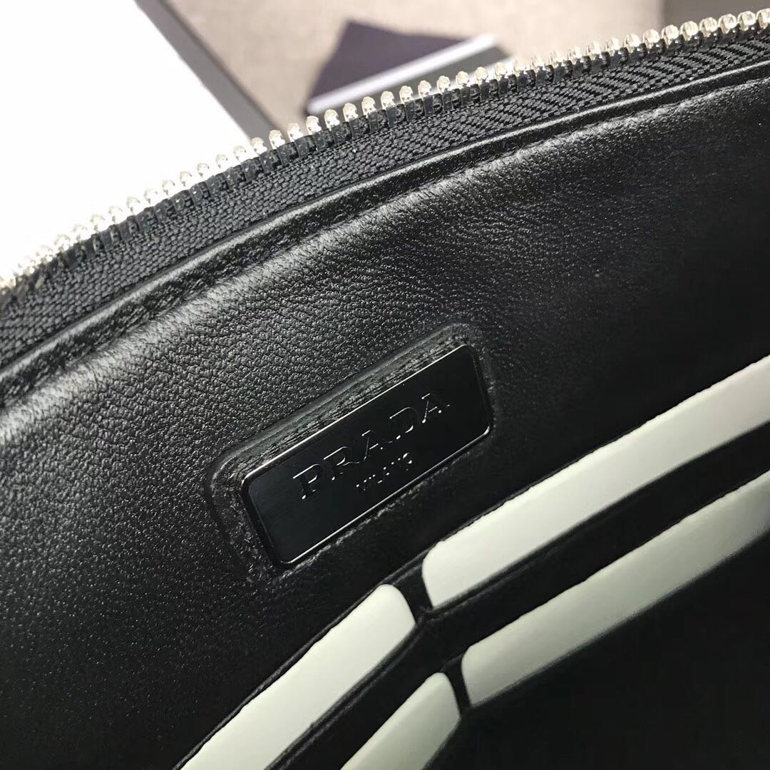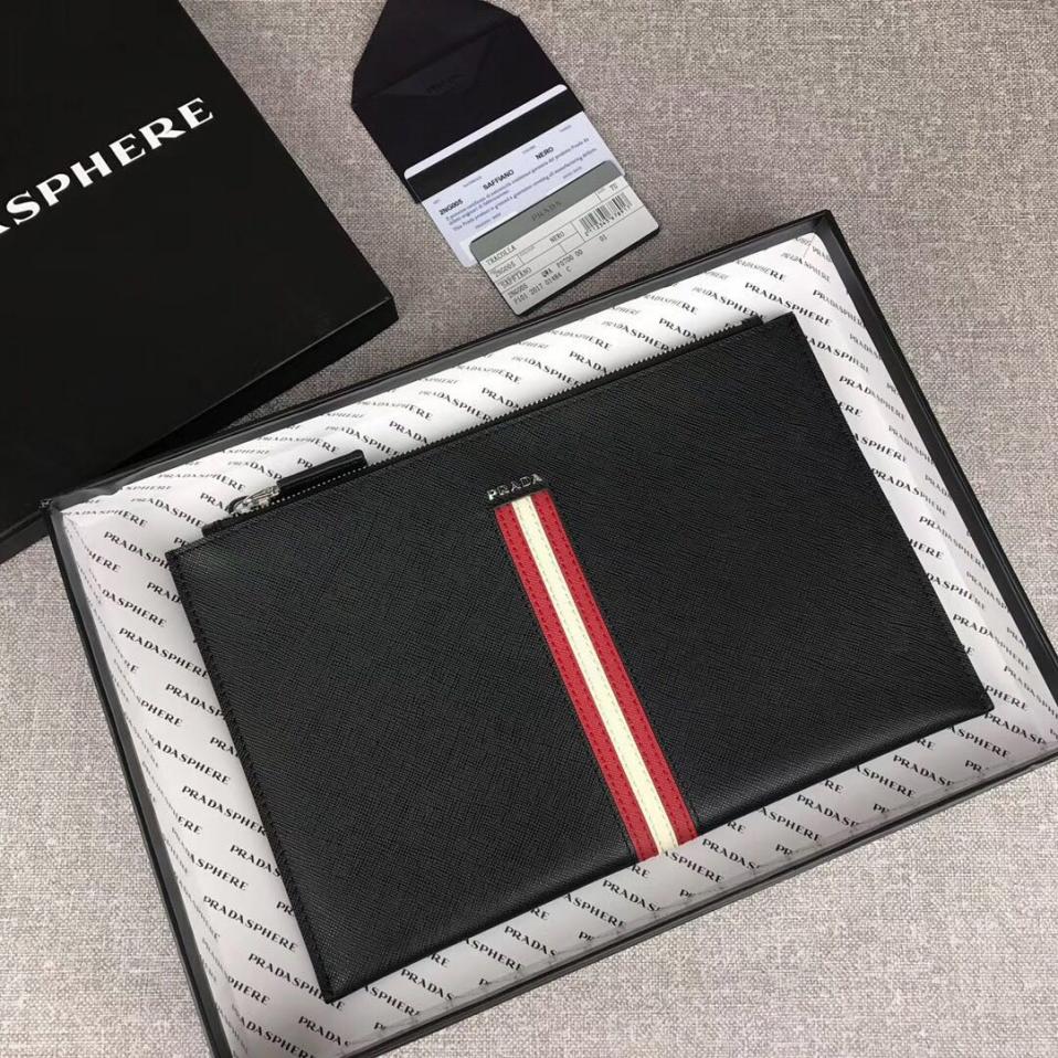 prada 黑红配2017【原单代购级】PRADA男士手包专柜最新款式,官网同步,正品开发,型号2NG005,颜色:蓝色/彩带,内码布标175代工码意大利顶级原单十字纹牛皮质感极好,内里进口羊皮,原单Lampo拉链 进口白钢五金配件!精湛走线均匀整齐 油边顺滑,做工精致如图可见,尺寸:长28cm高18cm【配原单包装盒身份证卡片编号可扫码】