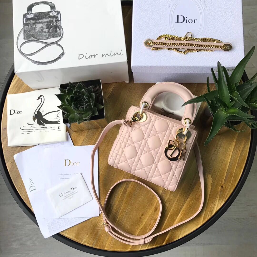 迪奥链条包包图片 Lady Dio.r mini️格 粉色/金扣 17cm原版小羊皮 格子飽滿 皮質軟軟顶级专柜品质不怕对比 M673