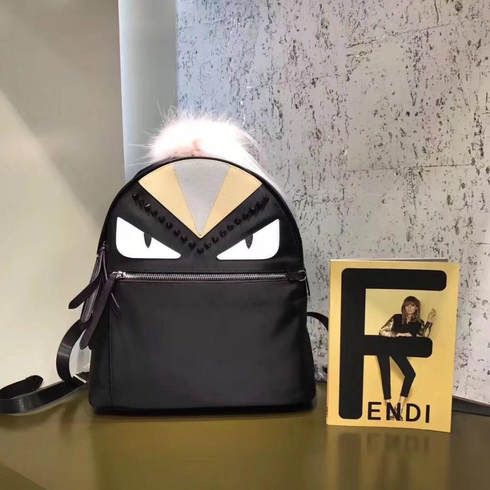 芬迪小怪兽双肩包材质 FENDI 2336 背包拉链开合,饰有正面口袋。内部另设一个拉链口袋。手挽和柔软的可调节肩带。黑色高科技尼龙制作,缀以同色系皮细节。装饰双色狐毛顶镶饰,让人联想起BAG BUGS怪物眼睛。镀钯饰面金属配饰。21cm_30cm(礼品袋发票)