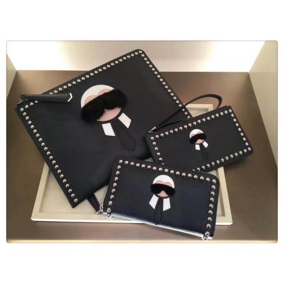 芬迪手包多少钱 FENDI 0363克公仔 小牛皮手拿包。采用周边钉饰和中间老佛爷造型装饰细节。顶部拉链和接裆式内里。FENDI ROMA标志和镀钯金属配件。26cm(全套包装发票)