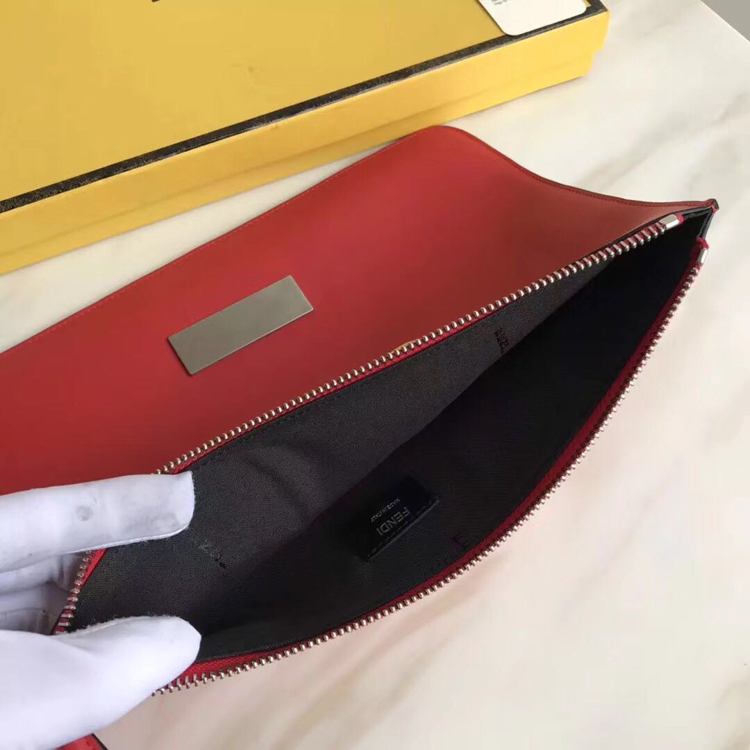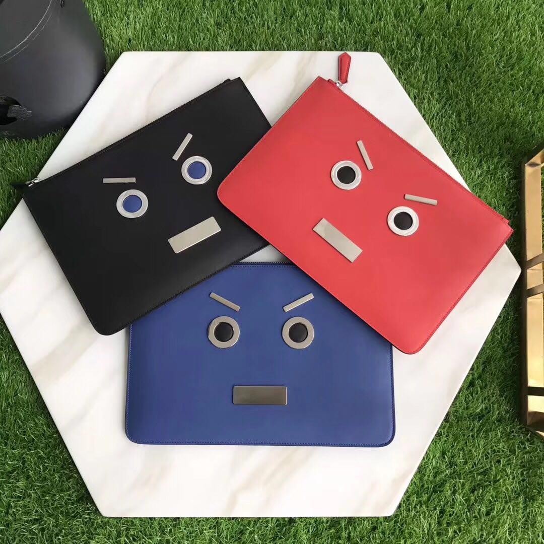 芬迪男士手包新款 FENDI 0078-SL9 平纹小牛皮手拿包,装饰由镀钯饰面和金属贴花组成的“无语”表情。 30cm(全套包装发票)