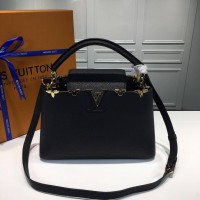 2017lv包包新款图片 新品 原单~m54664黑色中号手袋。本季讲述全新的Capucines故事。精致的金属色Monogram花卉饰带,使此款经典手袋散发出更加柔美的气质。小号尺寸,精致的黑色包身搭配金色花冠装饰,优雅而实用。Size:31x20x11(cm)