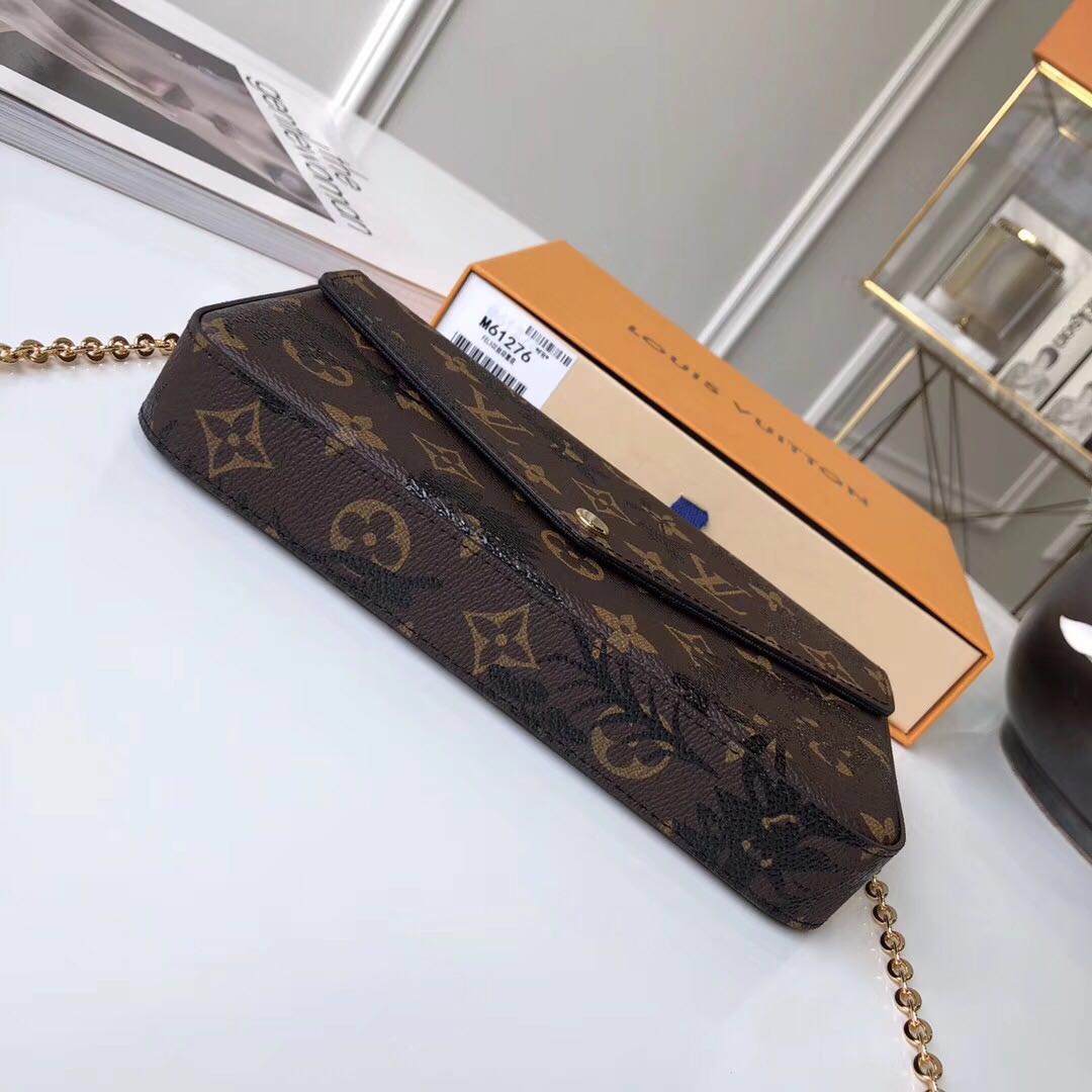 新款lv服装手提单肩包 新品原单 M61276 丝印黑花朵 手袋优雅华贵,内含两个可脱卸口袋,是携带整理您的日常用品的时尚之选。它不仅仅是款钱夹,除去金色链条后,它还可以用作迷人的手包或小型手袋。21.0 x 11.0 x 2.0 cm