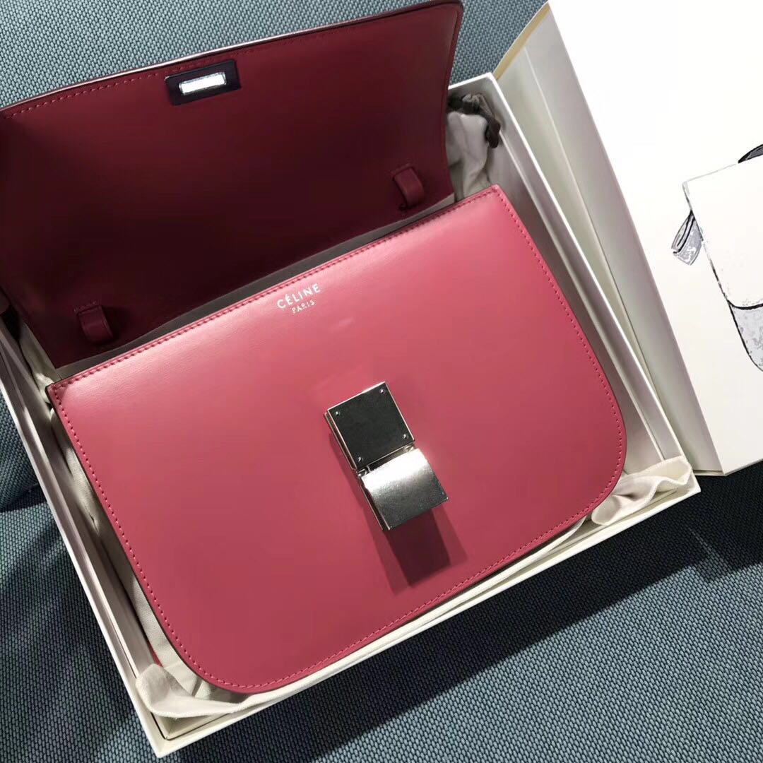celine box中号尺寸 枚红色是单品里最具气场特质,最佳色彩搭配选择除了最易搭的黑白之外,玫红+绿色,玫红+黄色,玫红+浅杏,玫红+玛萨拉红四个色彩组合分别体现着,时髦,摩登,优雅,贵气