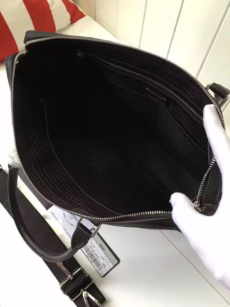 prada男包价格和图片 P家岀新款男包,0925黑色,目前专柜最新的男款,顶级货,采用进口小牛皮,手感起,格层多多哦,长36X高30cm