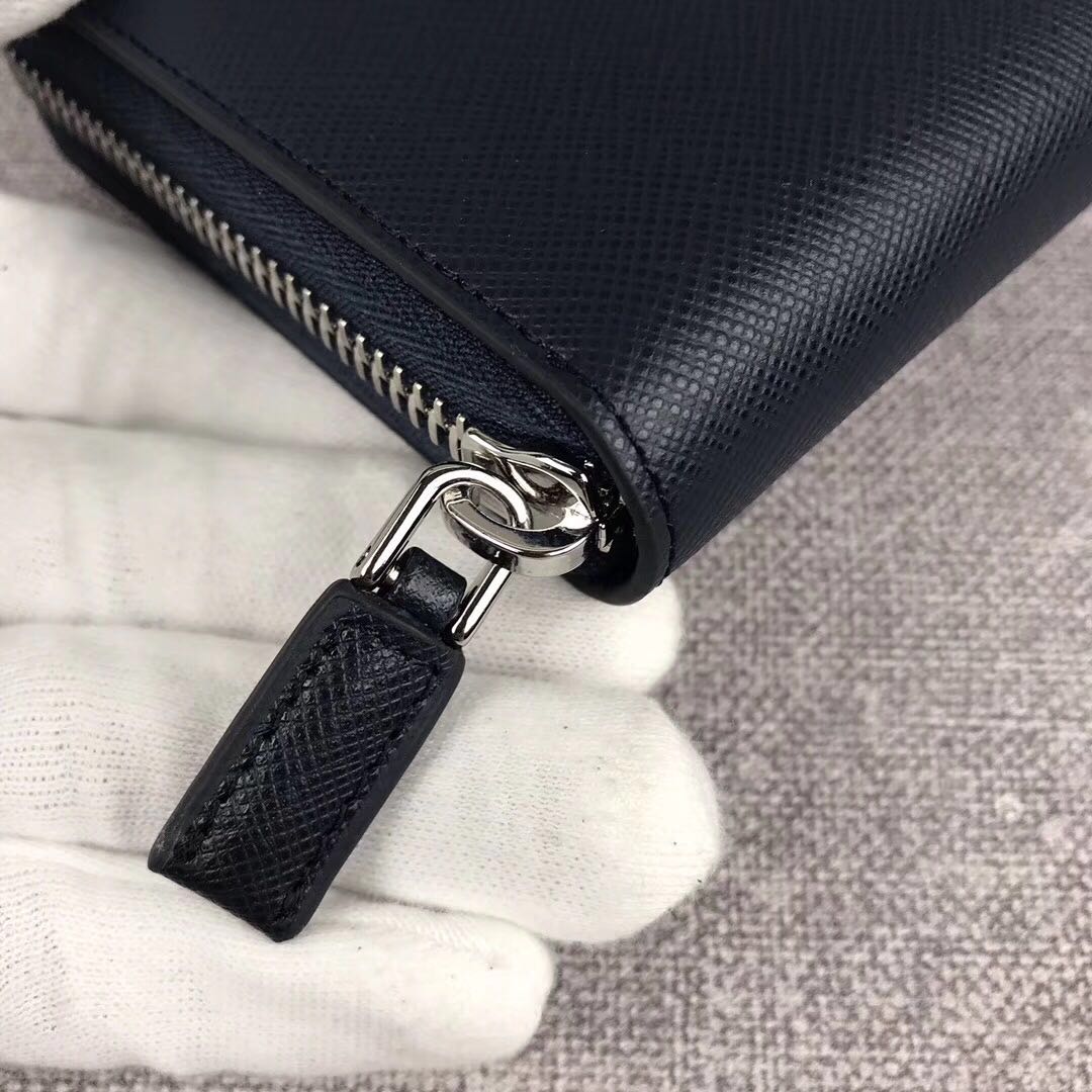 prada17新款钱包【原单代购级】PRADA男士单拉链钱包专柜最新款式,官网同步,正品开发,型号2ML317,颜色:深蓝+灰蓝/彩带鳄鱼皮,内码164代工码意大利顶级原单十字纹牛皮质感极好,进口螺纹里布 进口白钢五金配件!精湛走线均匀整齐 做工精湛 品质媲美正品,彩带鳄鱼皮更显高档,设计独特新颖尺寸:长20cm高10.5cm【配原单包装盒身份证卡片编号可扫码】